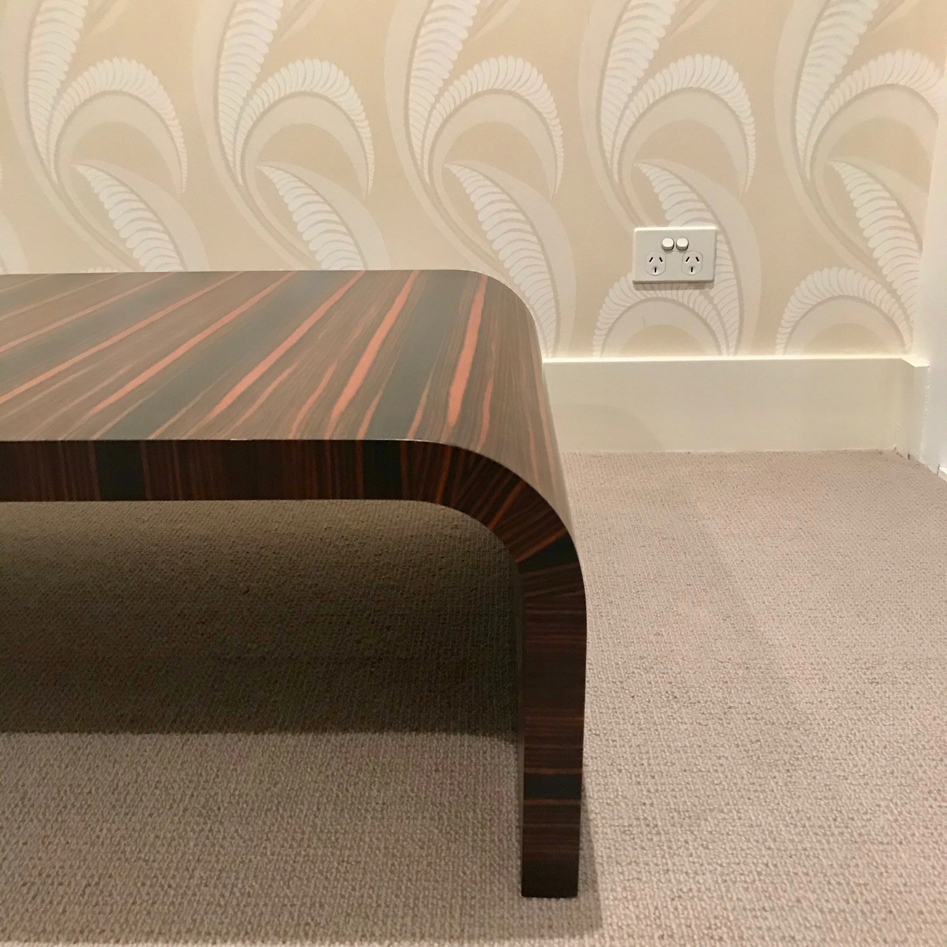 The coffee table we have on offer was purchased through Fanuli. The coffee table has a ribbon veneer.