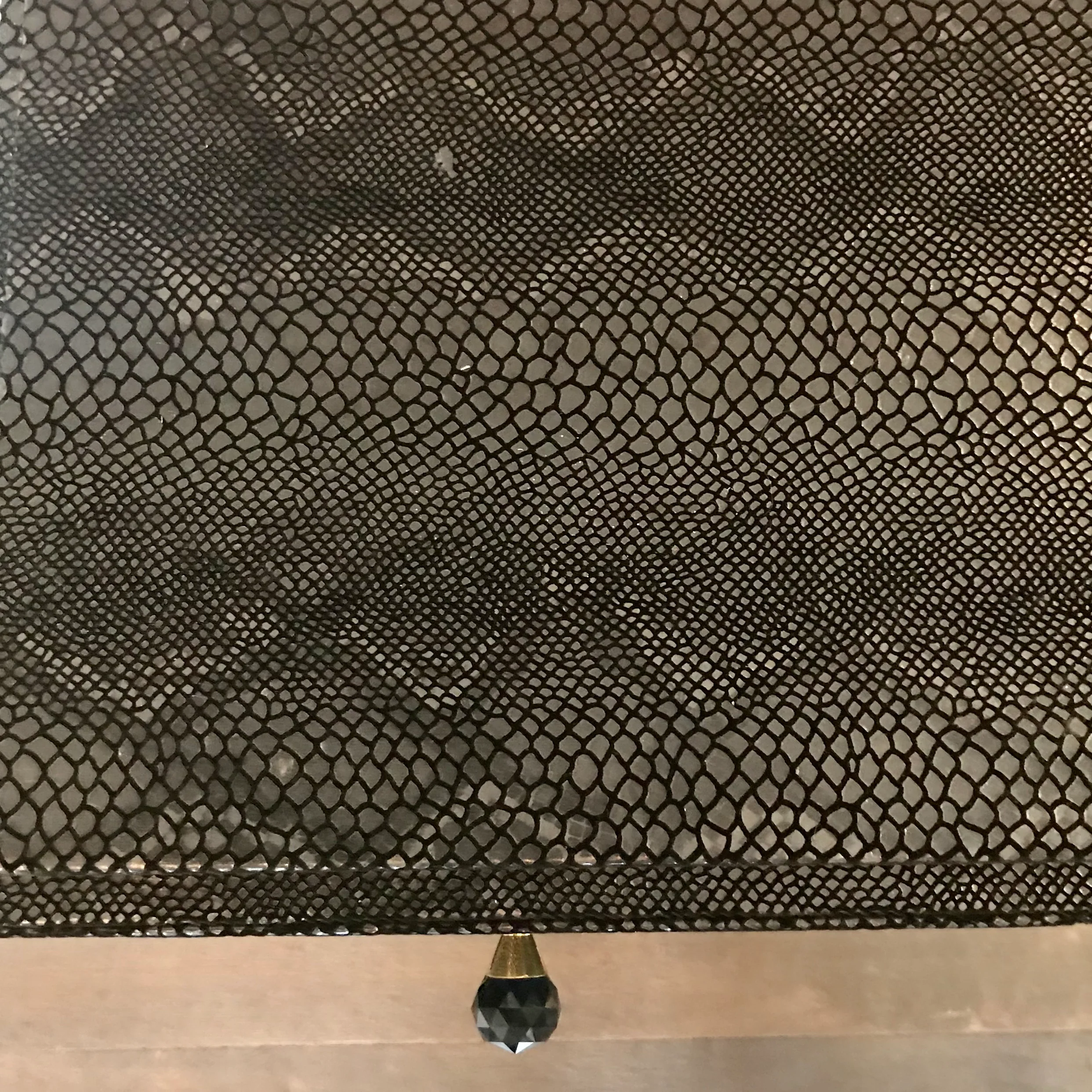 Revisit the dazzling world of a French cabaret through the Burlesque console. The acrobatic loops & spins of the base paired with black exotic skins and a black crystal on each one of the 4 drawers exude the mysterious traits of a feisty diva.