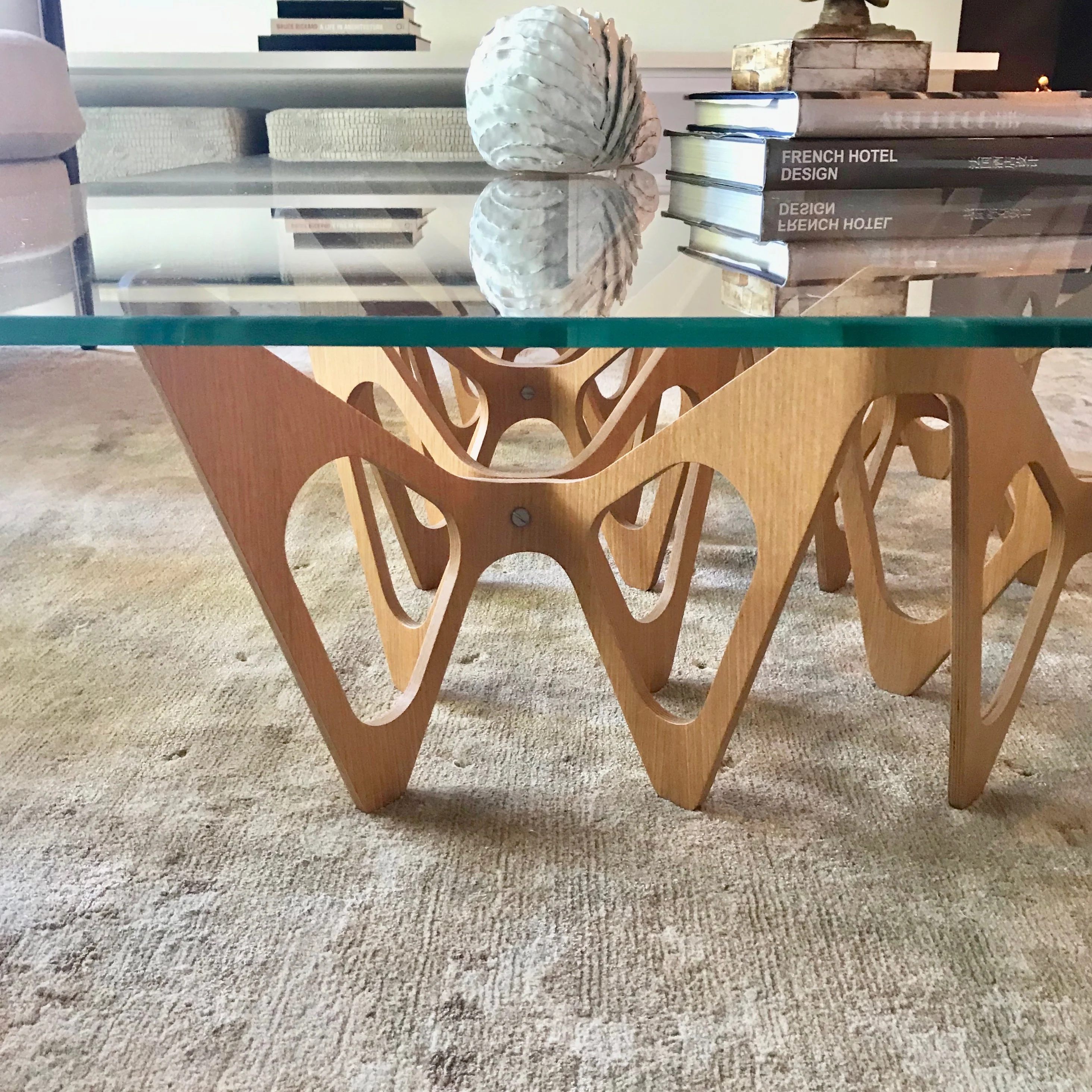 The Butterfly coffee table designed by Alexander Taylor for Zanotta has an intricately designed and constructed base frame of bent plywood and veneered in a choice in natural oak. Top in 10mm thick tempered plate glass. The table comes with two sizes of the glass top, the larger one is shown in the photo, the dimensions for the smaller one are also listed below.