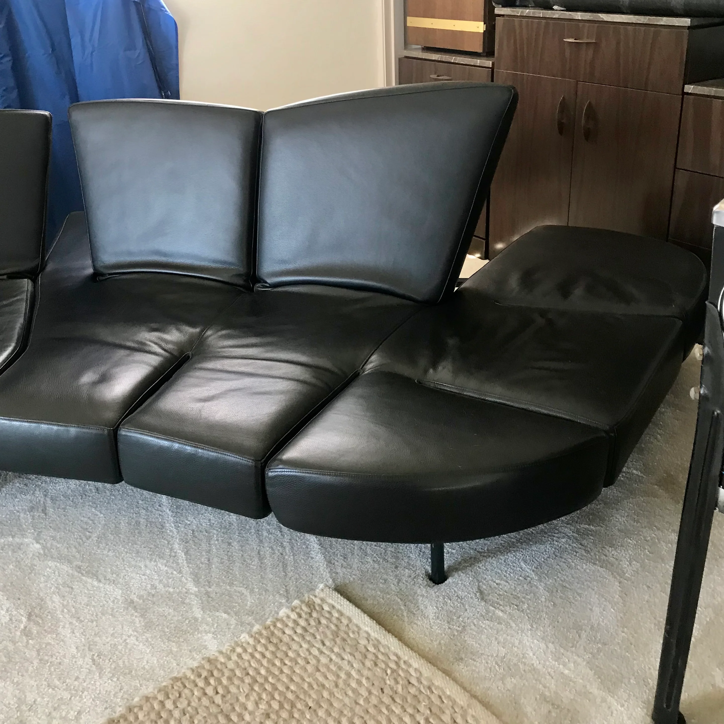 The Flap Sofa by Francesco Binfares for Edra Italy winds as flexuously as a ribbon, proposing, after a profusion of perpendicularly, the appeal of a slender, dynamic line. Thanks to a series of back, armrests, headrests and movable front supports, Flap offers a wide variety of seating positions, thereby creating a different system of interpersonal relations. The sofa we have on offer has a black steel frame with foam cushioning, and black leather upholstery.