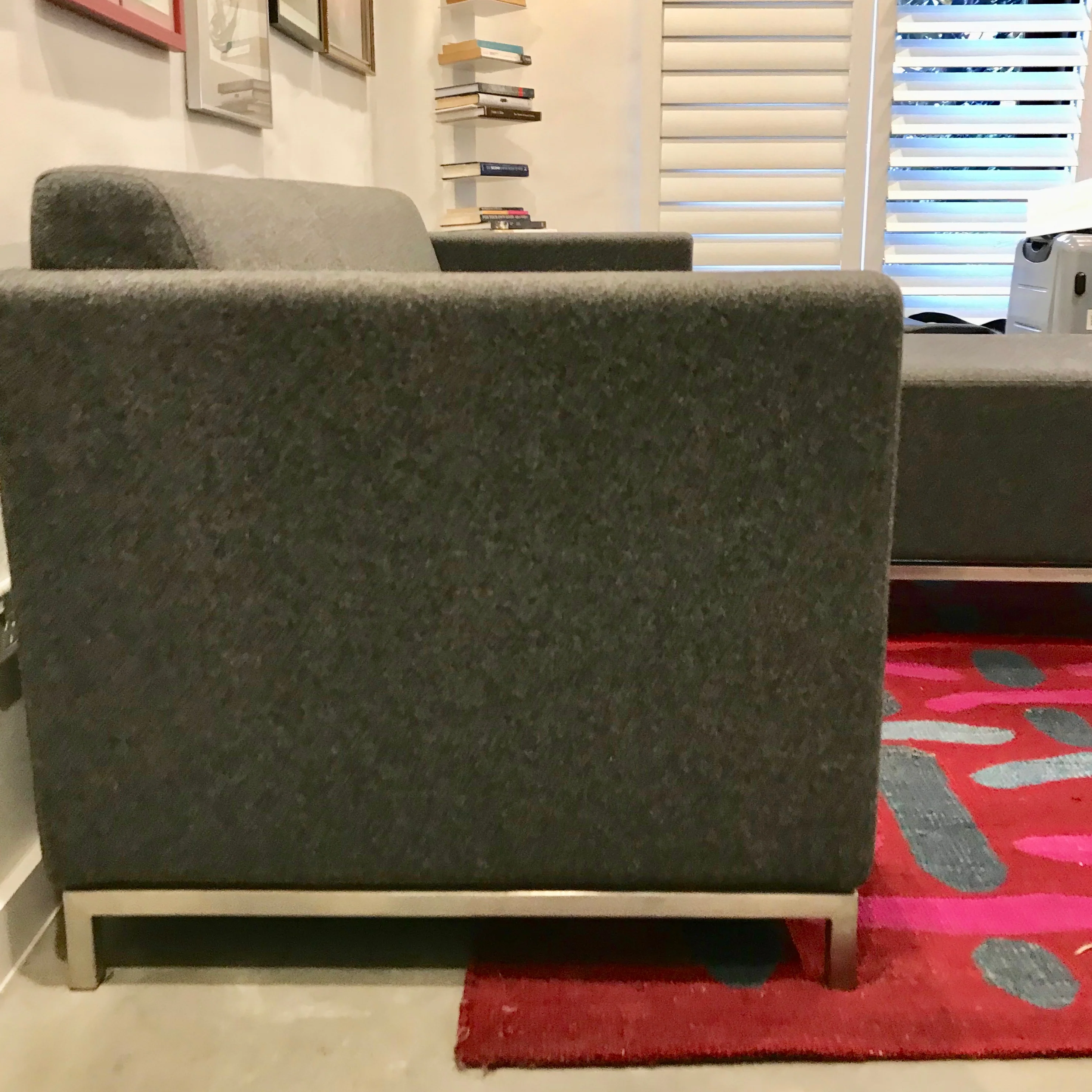 The Eco Two Seat Sofa & Ottoman through Yazz we have on offer has a brushed stainless steel frame with grey wool fabric.