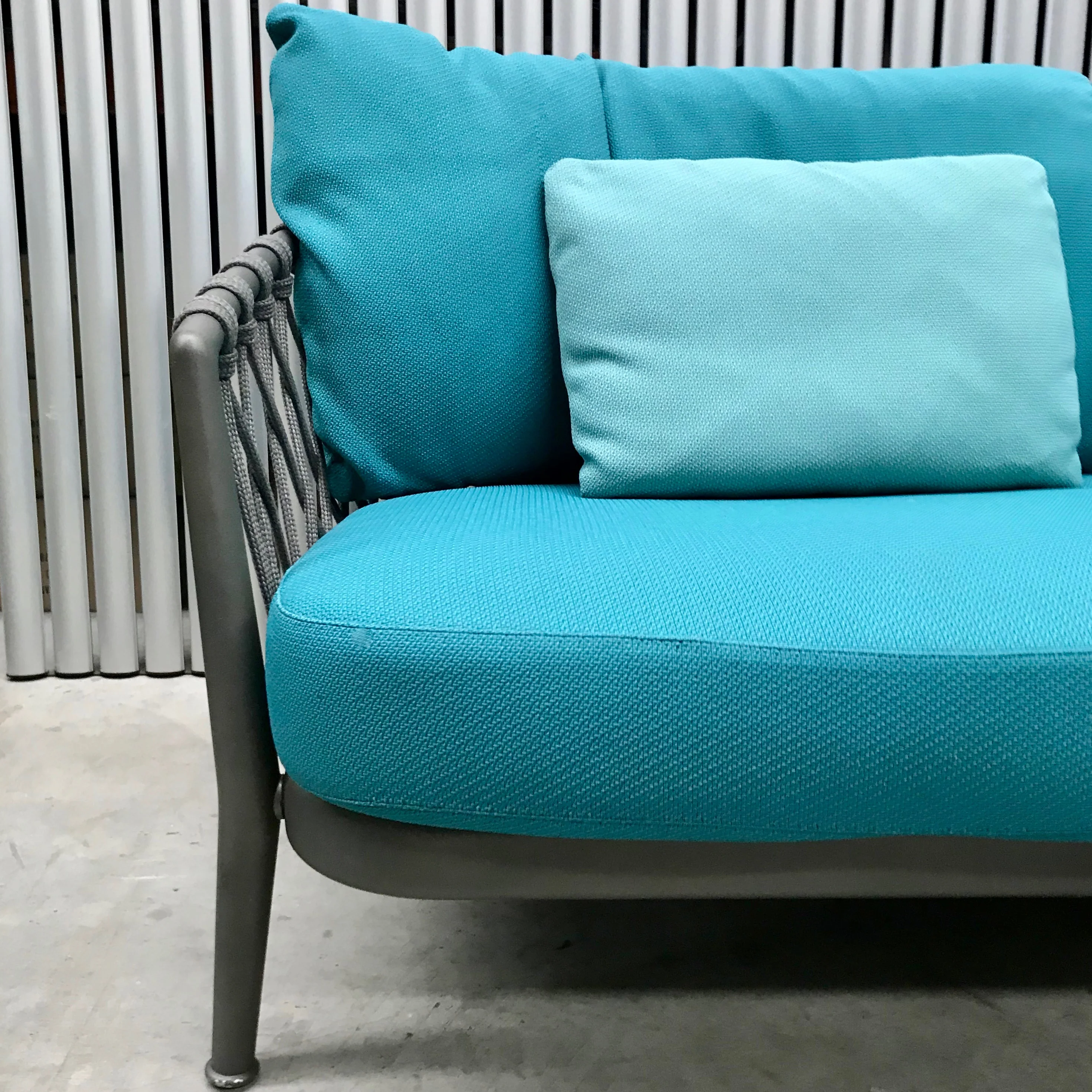 Armchair, sofa, a chair, even in the stackable version, offer a technological blend of extruded and die-cast aluminium elements. Their lightness and design suggest their use both in public and residential settings, complying with ergonomic and environmental adaptability criteria. The seat and back cushions ensure high comfort relaxation. The painted frames present three finishes that match the high resistance synthetic fabric interlacing that have been studied for outdoor use: white painted aluminium frame with tortora colour polypropylene fibre interlacing, tortora painted aluminium frame with tortora colour polypropylene fibre interlacing, anthracite painted aluminium frame with anthracite colour polypropylene fibre interlacing.