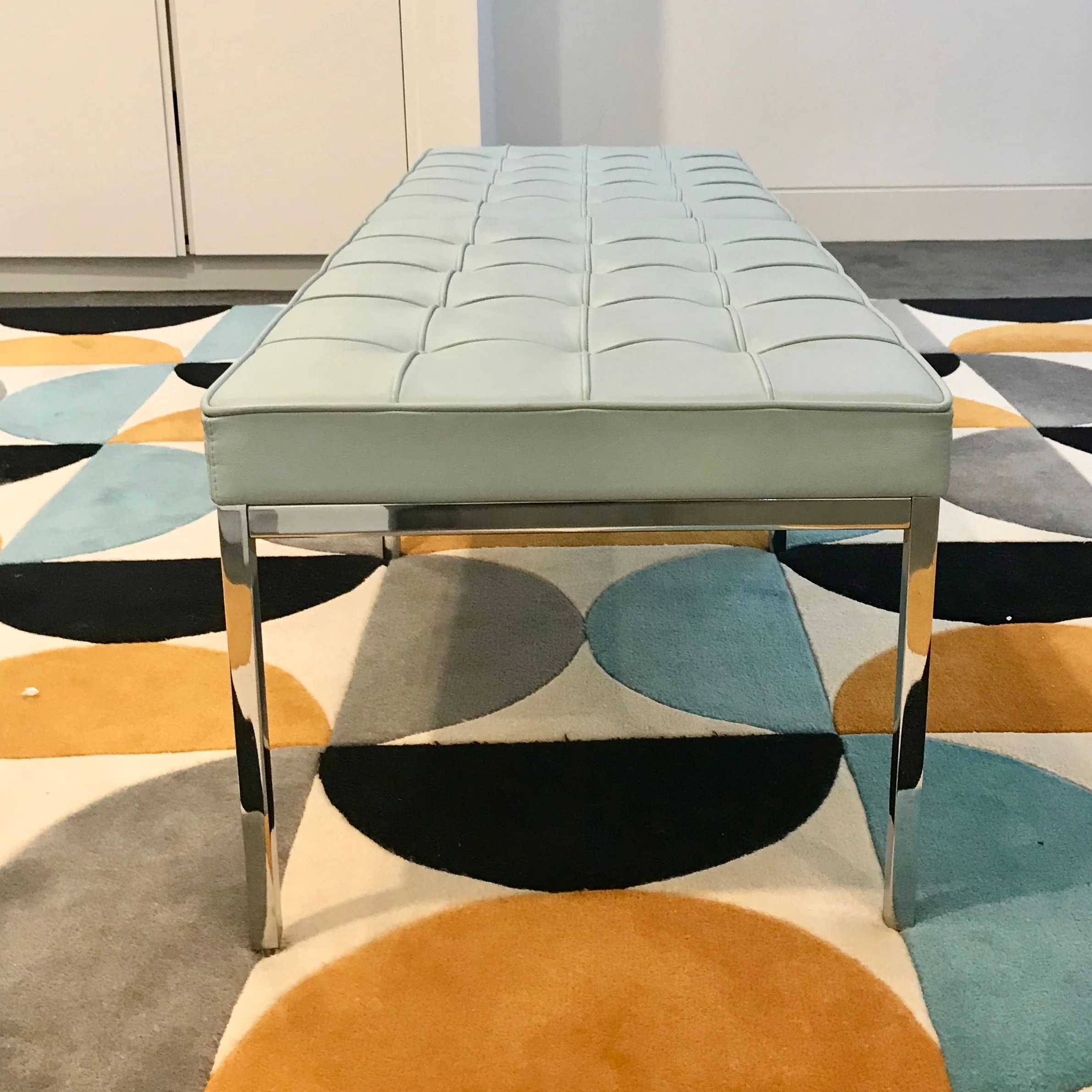The bench has a metal frame and legs in heavy gauge square-section steel, finished in polished chrome. Seat cushions in multi-density foam core may be upholstered in fabric or leather. The bench we have on offer is upholstered in pale blue leather.
