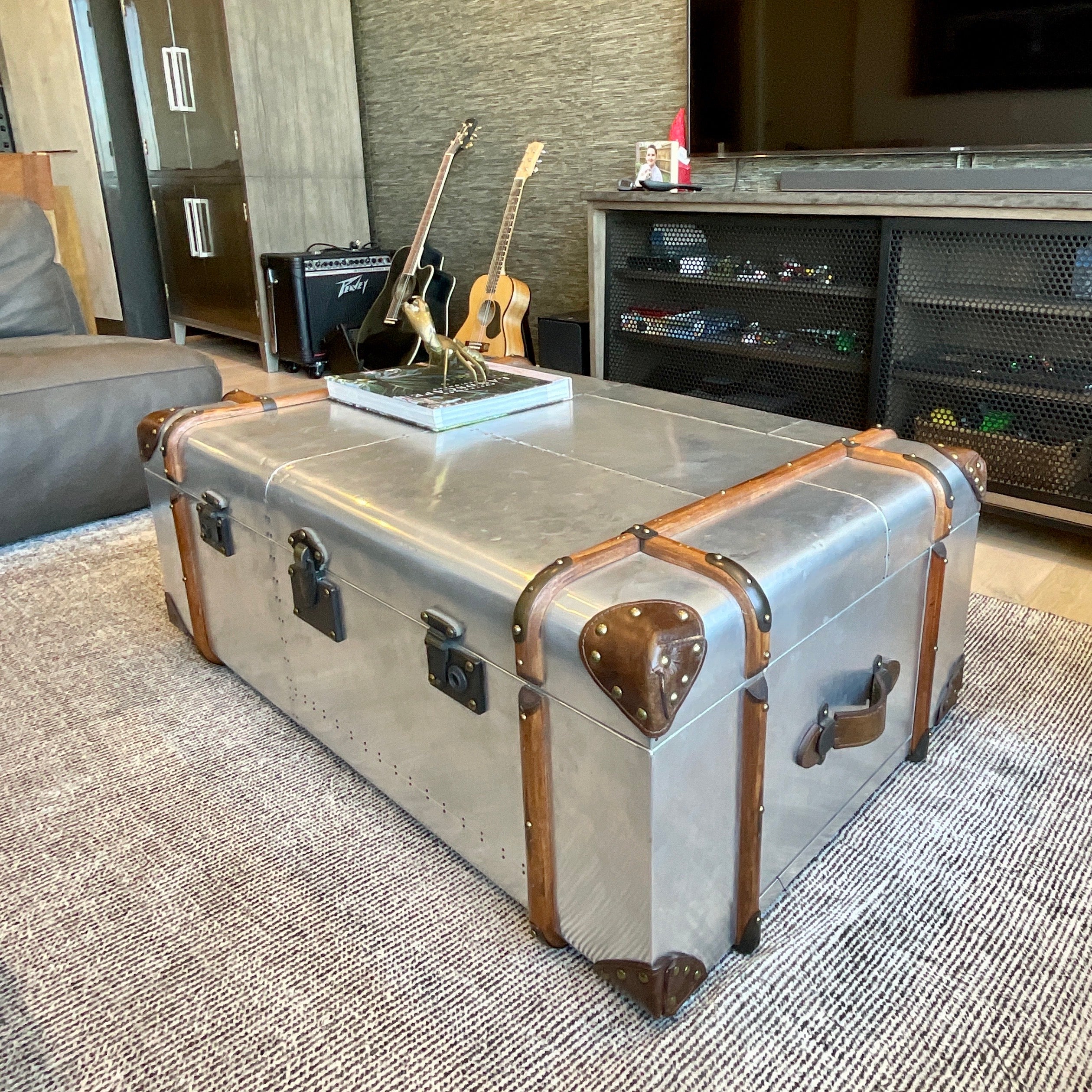A modern reinvention of an antique trunk. The romantic era of high sea voyages provides the backdrop for the story of the Globetrekker Coffee Table. This enchanting handcrafted piece comes inspired by the vintage trunks used by the passengers on these treks. Each trunk features intriguing detailing and beautiful plating enhanced further by black wooden banding and silver polished hardware. The exterior boasts hand-applied aluminum with nail detail and leather corner caps and handles. This winsome trunk table is sure to create a captivating scene in the loft or industrial style lounge.