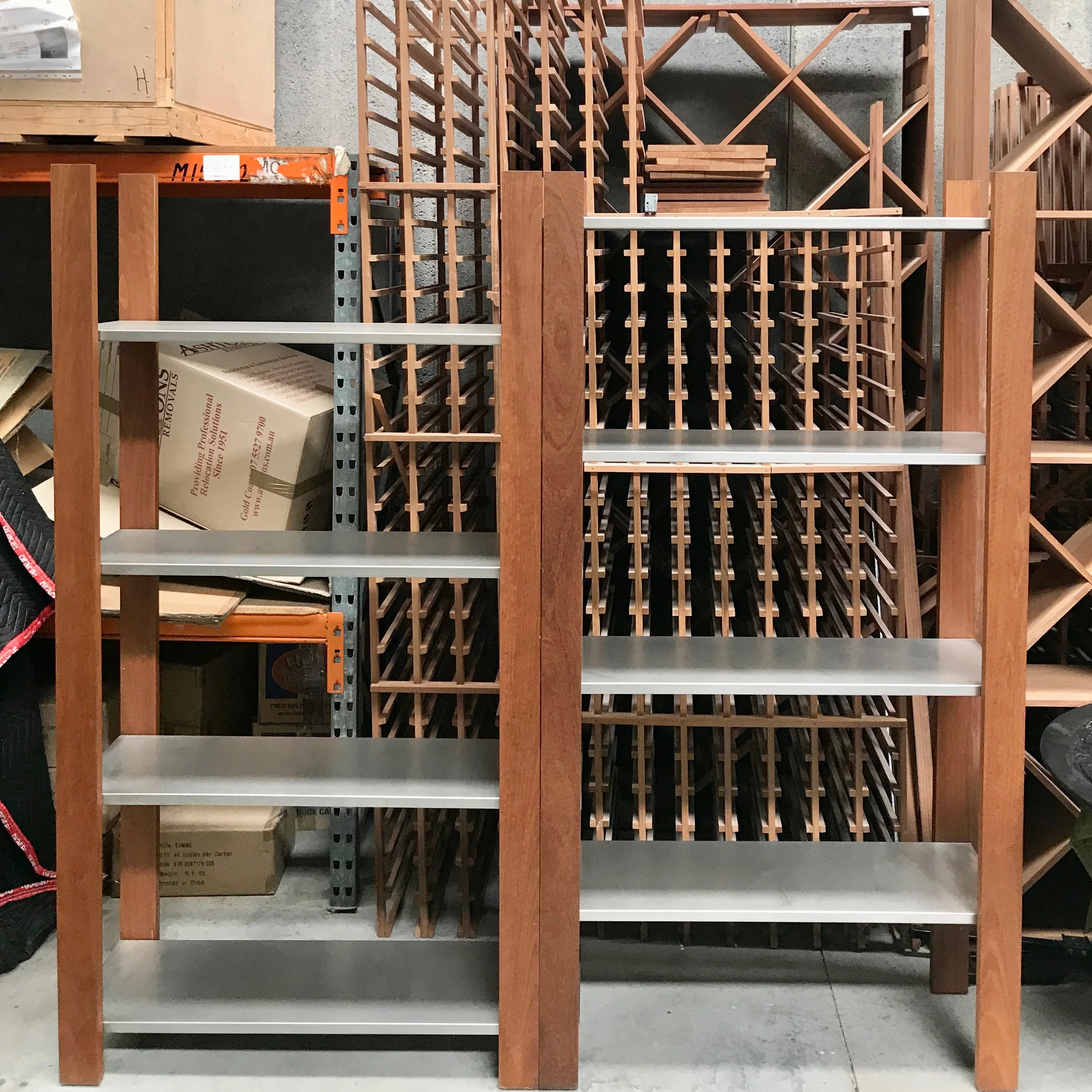 The Intersection Shelving Unit by Planet Furniture is constructed from solid spotted gum. Shelves are stainless steel they will not sag or buckle. Unit contracts and expands for variable width.