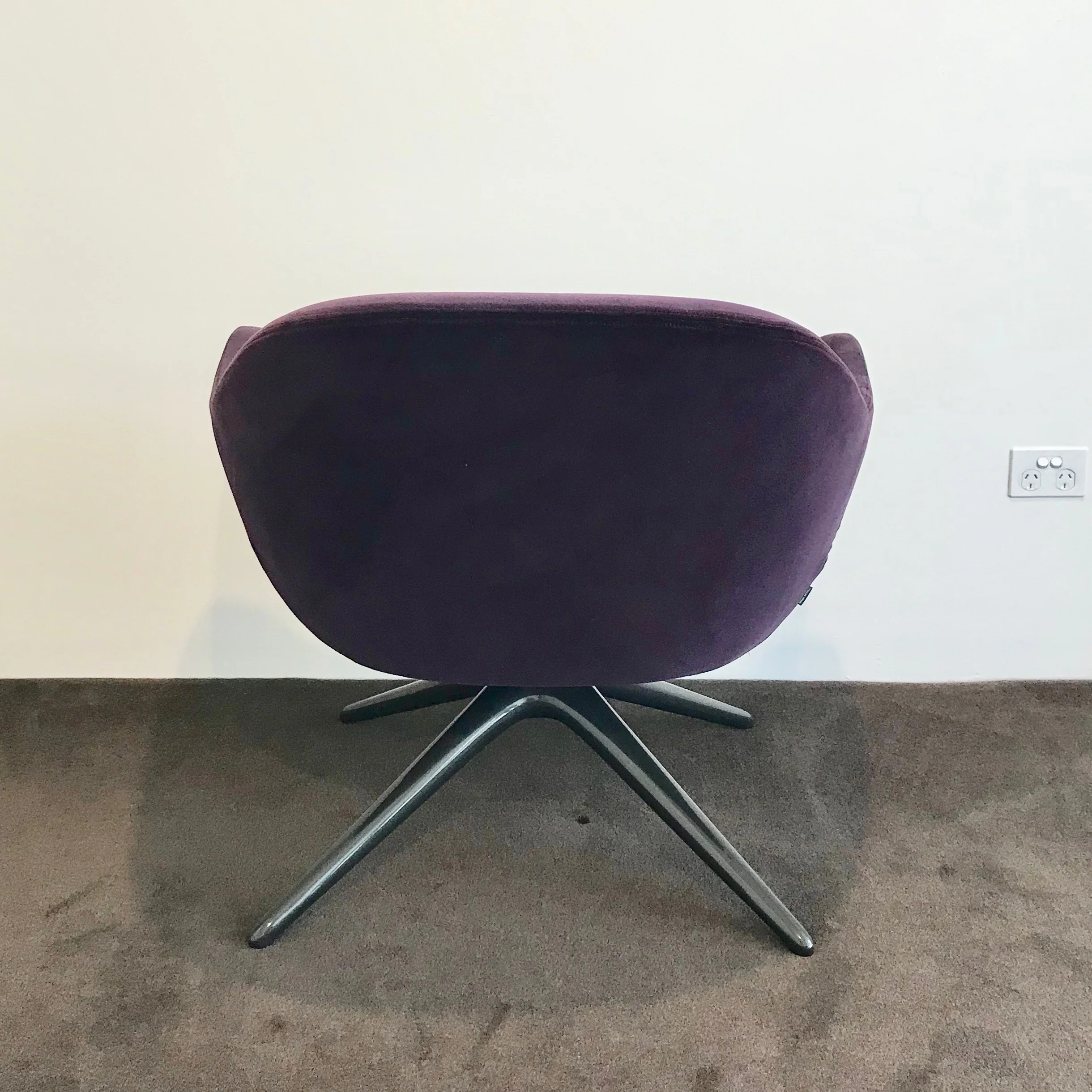 Designed by Marcel Wanders for Poliform, the Mad Chair has a harmonious structure and soft shell seat. A nod to the 50s style found in the TV series Mad Men, the form strongly suggests an ideal design free from any material boundaries. The chair we have on offer has a metal 4 leg base with a rich purple velvet upholstery.