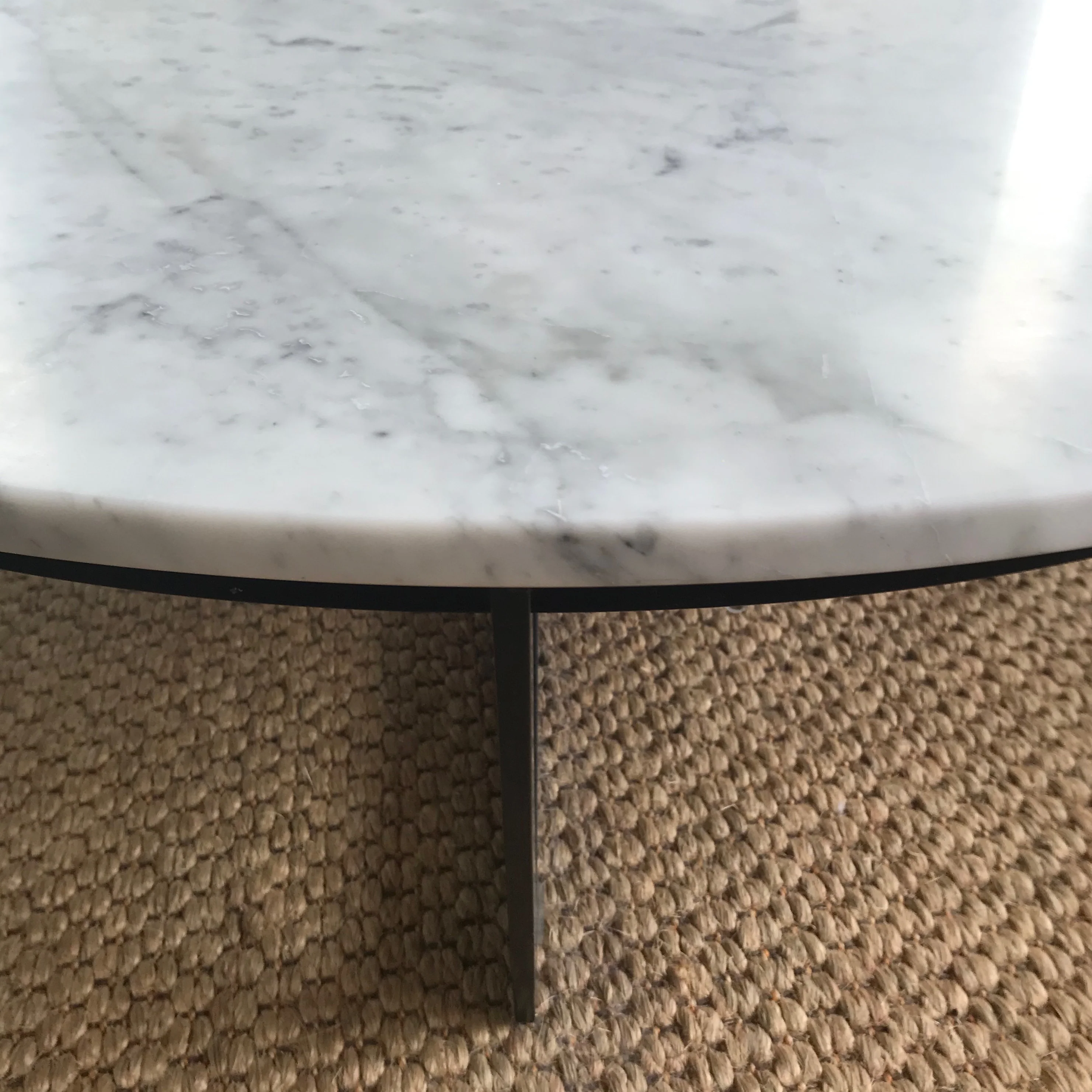 The coffee table we have on offer from MCM House has a black flat metal frame with marble top.