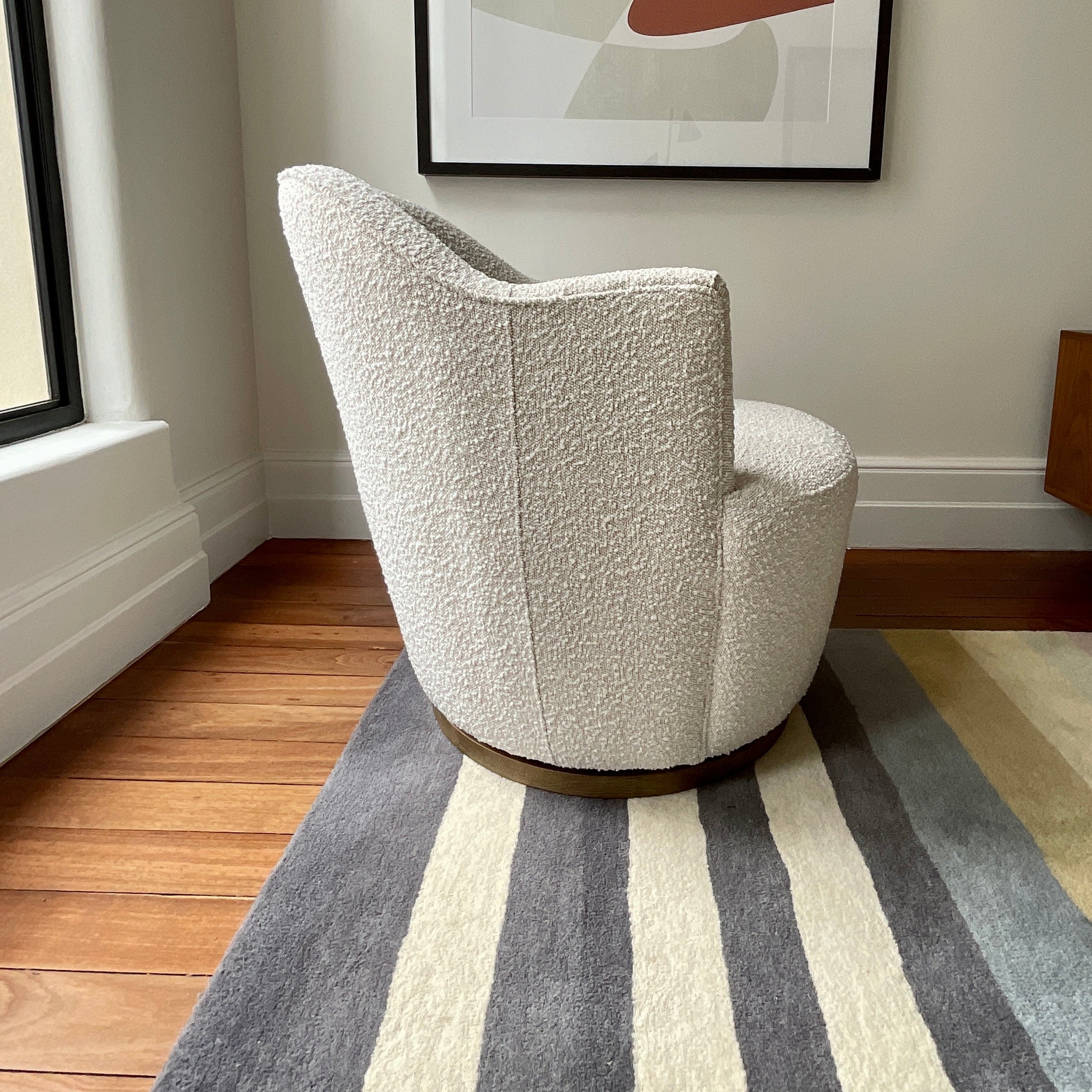 The Milou Swivel Chair features a tightly upholstered seat and back atop a cylindrical Oak base with a fully articulated swivel mechanism. The barrel back silhouette and thin, sculptural arms give this chair a Modernist sensibility without sacrificing comfort. The hardwood frame is crafted for longevity and provides superior comfort. Available in a curated fabric selection of natural boucle. Part of the Studio Amsterdam collection of upholstered sofas and lounge chairs, designed in Holland for comfort and style. Inspired by contemporary Dutch design for a minimalist European aesthetic. The chair we have on offer is in a Ivory Boucle with timber oak base.