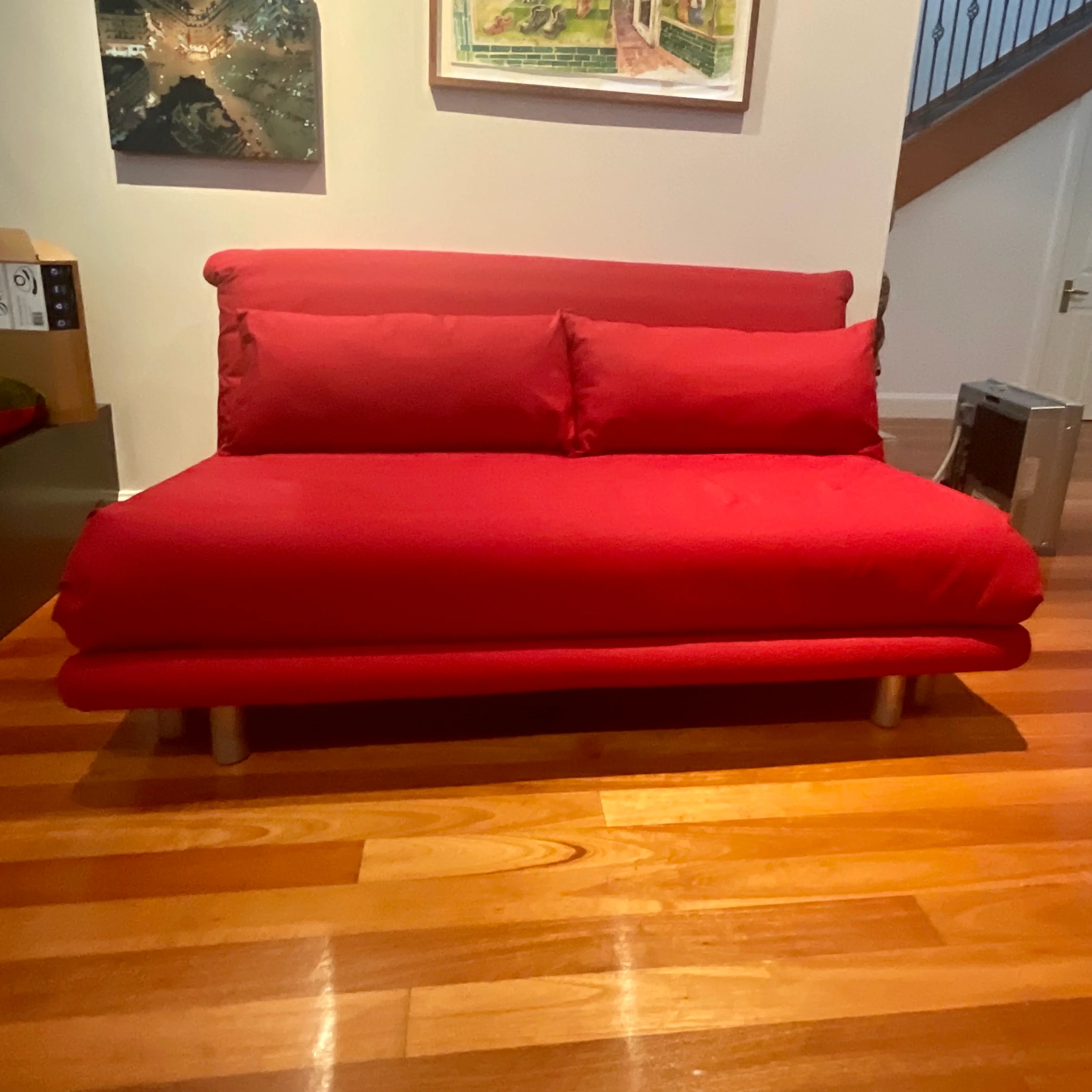 Ligne Roset’s Multy sofa bed is an indispensable piece for modern living. Designed by Claude Brisson, the Multy is truly versatile. As a sofa, the Multy is supremely comfortable and displays sleek lines; folded out to a chaise lounge, it offers luxurious space for repose; and laid flat, Multy transforms to a stylish bed for guests to offer a serene night’s sleep. Available in a range of varied fabrics and colours, the Ligne Roset Multy sofa bed can be customised to suit every home’s interior décor. MULTY has been specially designed for use as a bed on an everyday basis. MULTY offers three positions: sofa, chaise-longue and sofabed. Made in France. The Multy we have on offer is in a red fabric. The base and back is polyether foam.