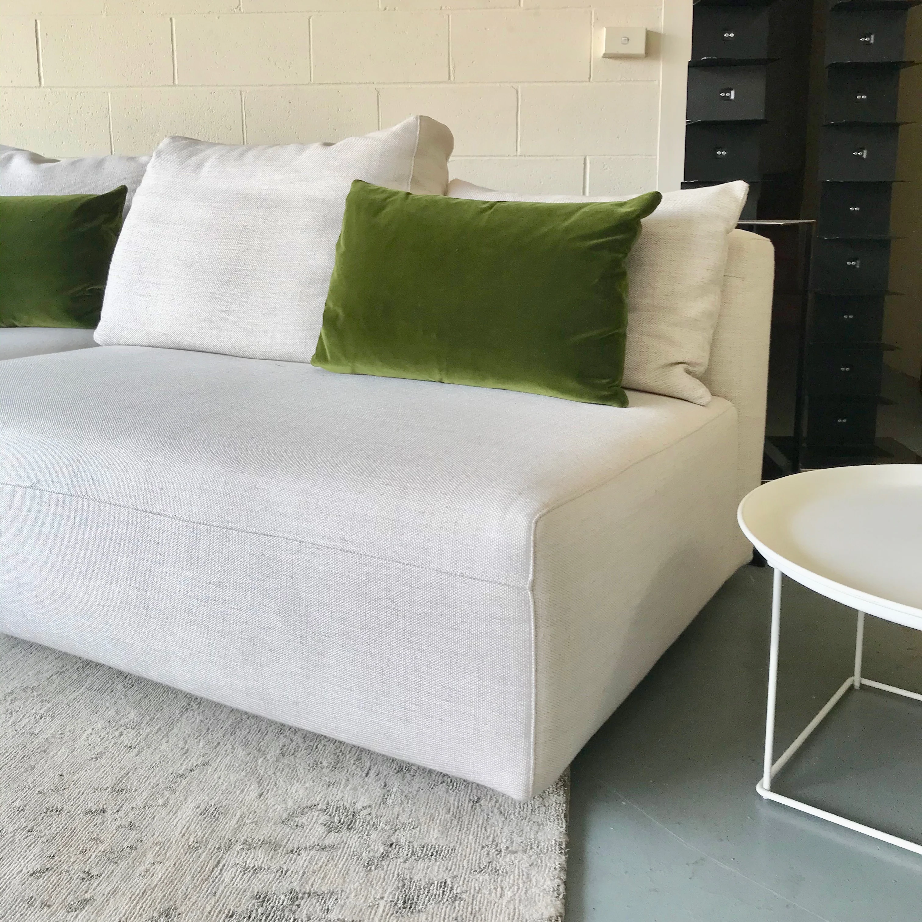 Party couch can be composed with different modules. The sofa we have on offer is made up of two pieces with a shelving unit. The upholstery is a neutral off white fabric and the table has a black metal frame with cream leather top.