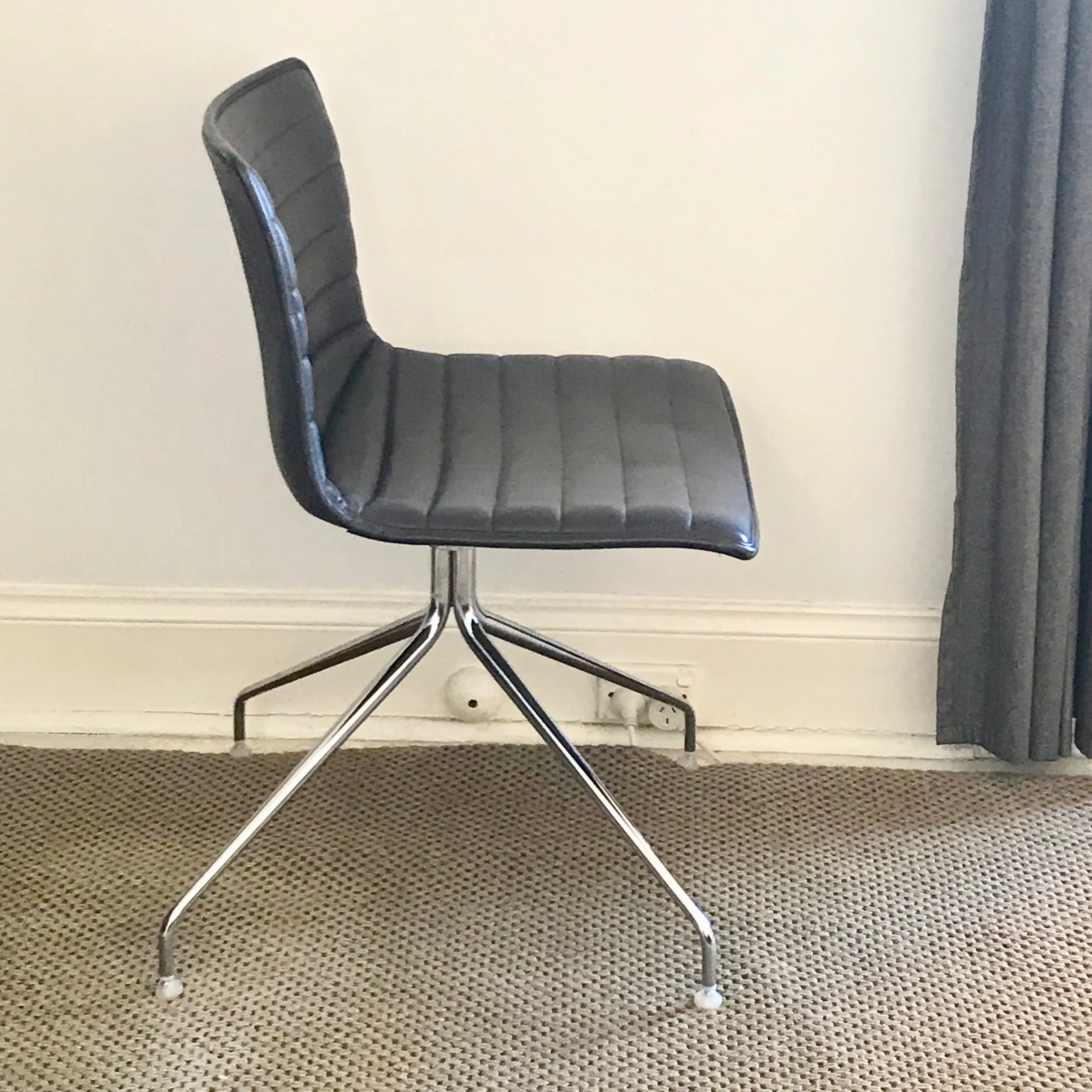 This set of FOUR Catifa 53 Trestle Swivel Chairs by Lievore Altherr Molina for Arper was originally designed in 2001. The chairs we have on offer have a chromed four star base with a hard leather upholstered seat over polypropylene shell. The chairs we have on offer are in brown leather.