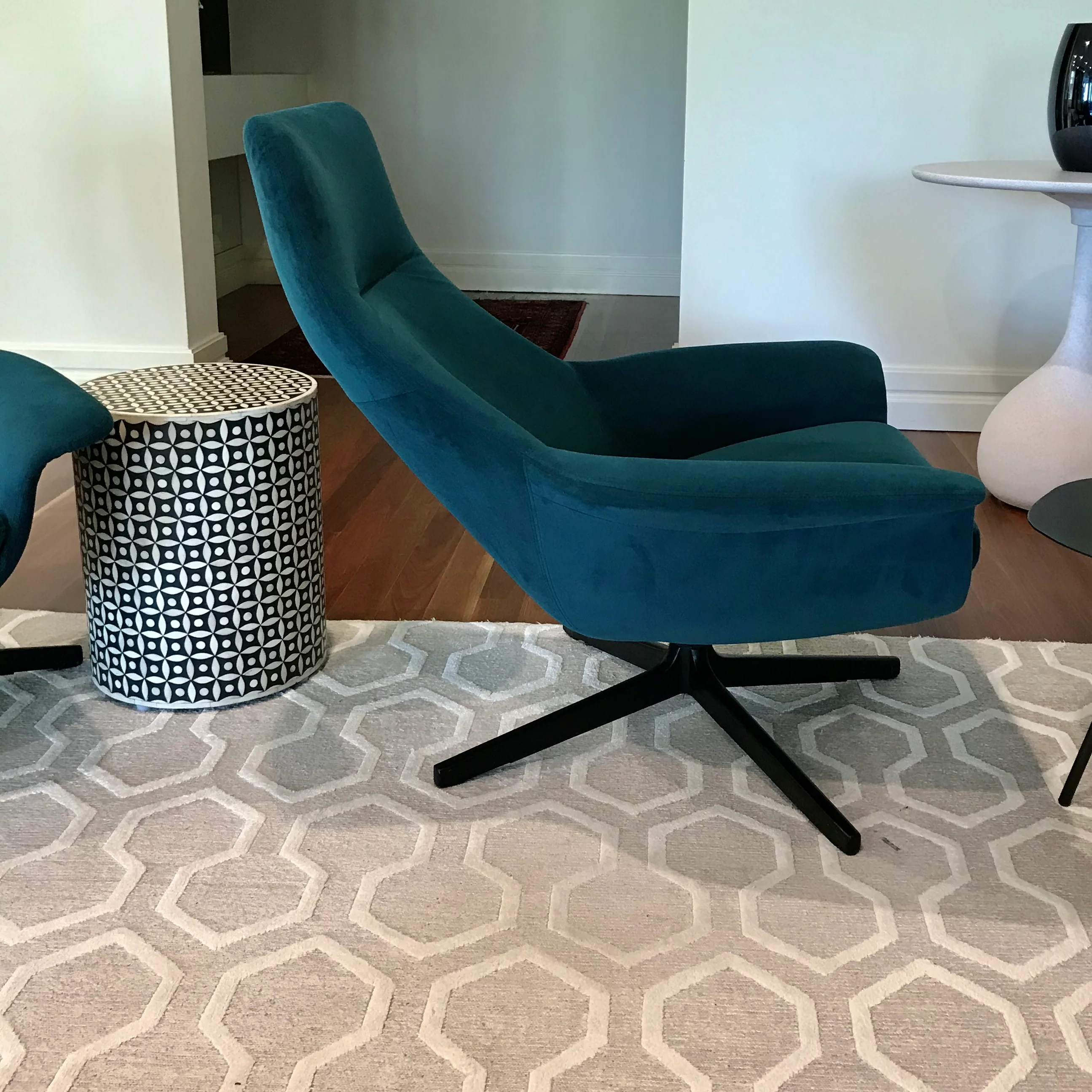 The Seymour chair by King is a unique Australian design by Charles Wilson. Quality materials and workmanship deliver a robust and beautiful chair. The chair we have on offer has a black timber swivel base with Mayfair Velvet colour Peacock.