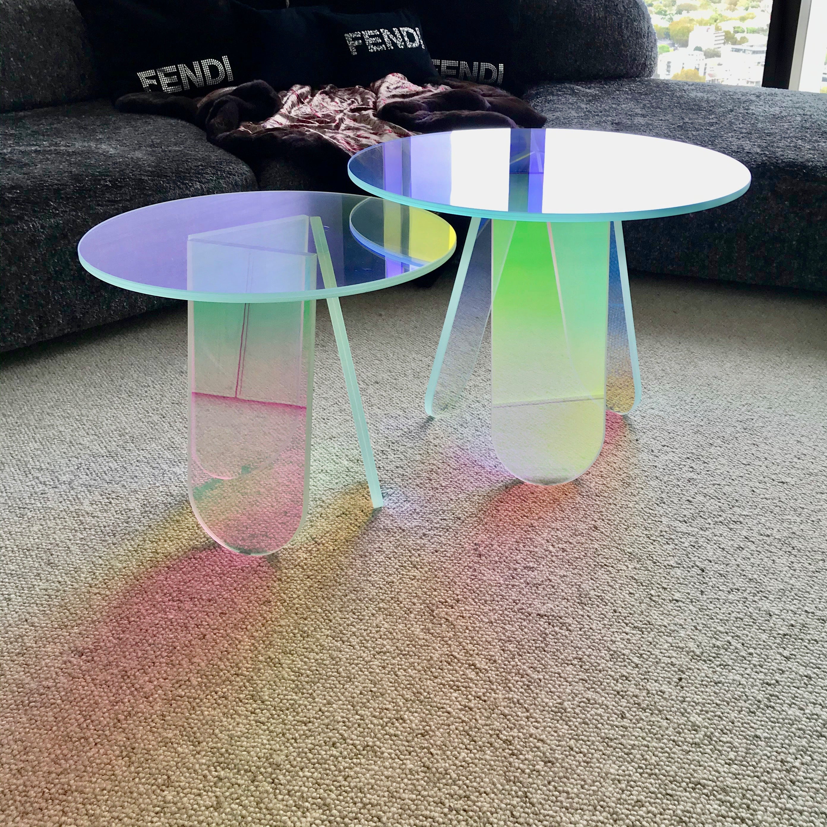 Group of low laminated and glued glass round tables, characterised by a special iridescent multicoloured finish; the nuance varies according to the incidence angle of the light and to the vantage point. Objects with magical and ethereal appearance emerge.
