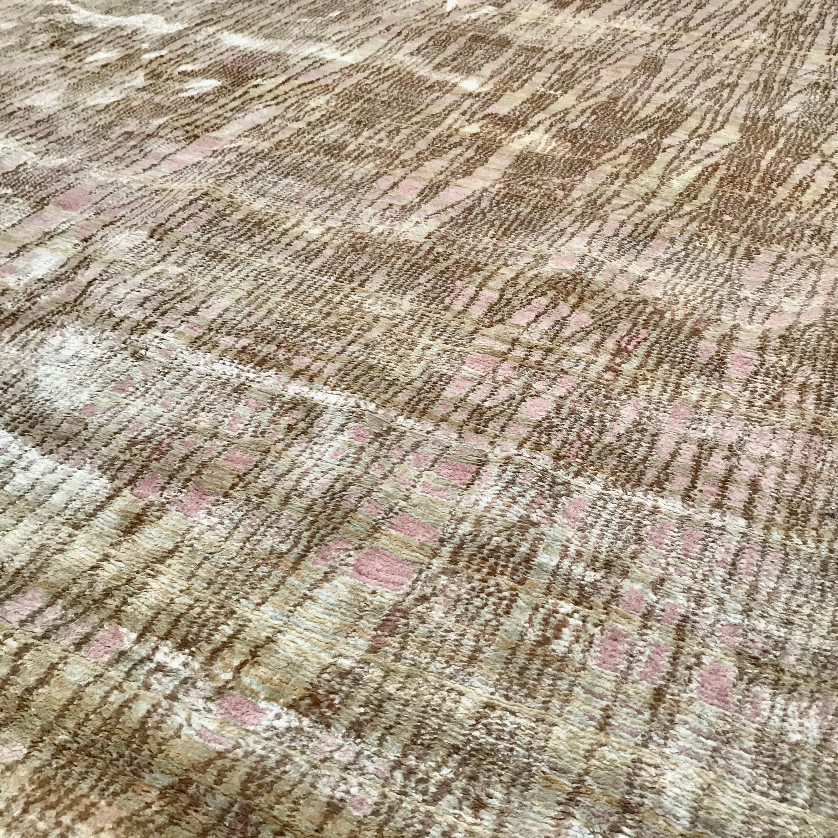 Silk Area Rug by Carini.Lang New York. Hand knotted wool & silk. Colour; Beige, red, brown . For over fifteen years, Joseph Carini Carpets have been designed in New York, woven in Nepal, and inspired by the world in between. Founded in 1997 by Joe Carini and Aurelie Lang, the emphasis of the company is focused on exploring the use of unusual natural dyes., natural fibers, and authentic traditional weaving techniques. Joseph Carini began working with Tibetan and Nepalese carpets in 1991 and so has had a long history with the design revolution which took place in this field over the last two decades. Previous to that he was an expert in the antique carpet world, dealing mostly in collectible tribal rugs. His infatuation with rare and unusual rugs lead him to an in-depth study of the use of colours, specialised natural dyes, design etymologies and weaving techniques. The lost knowledge he was able to accumulate and apply to his work makes Joseph Carini Carpets one of the last of the modern rug makers in the world to use authentic Tibetan knotting techniques as well as creating dyes from scratch. The colours we use are connected with healing plants and rooted in Ayurvedic science. How colour effects our emotional and physical life are questions which have informed our work from the beginning. By preserving traditional processes and fusing them with visionary design, Joe hopes to bring the magic from the past into the contemporary world in which we live.