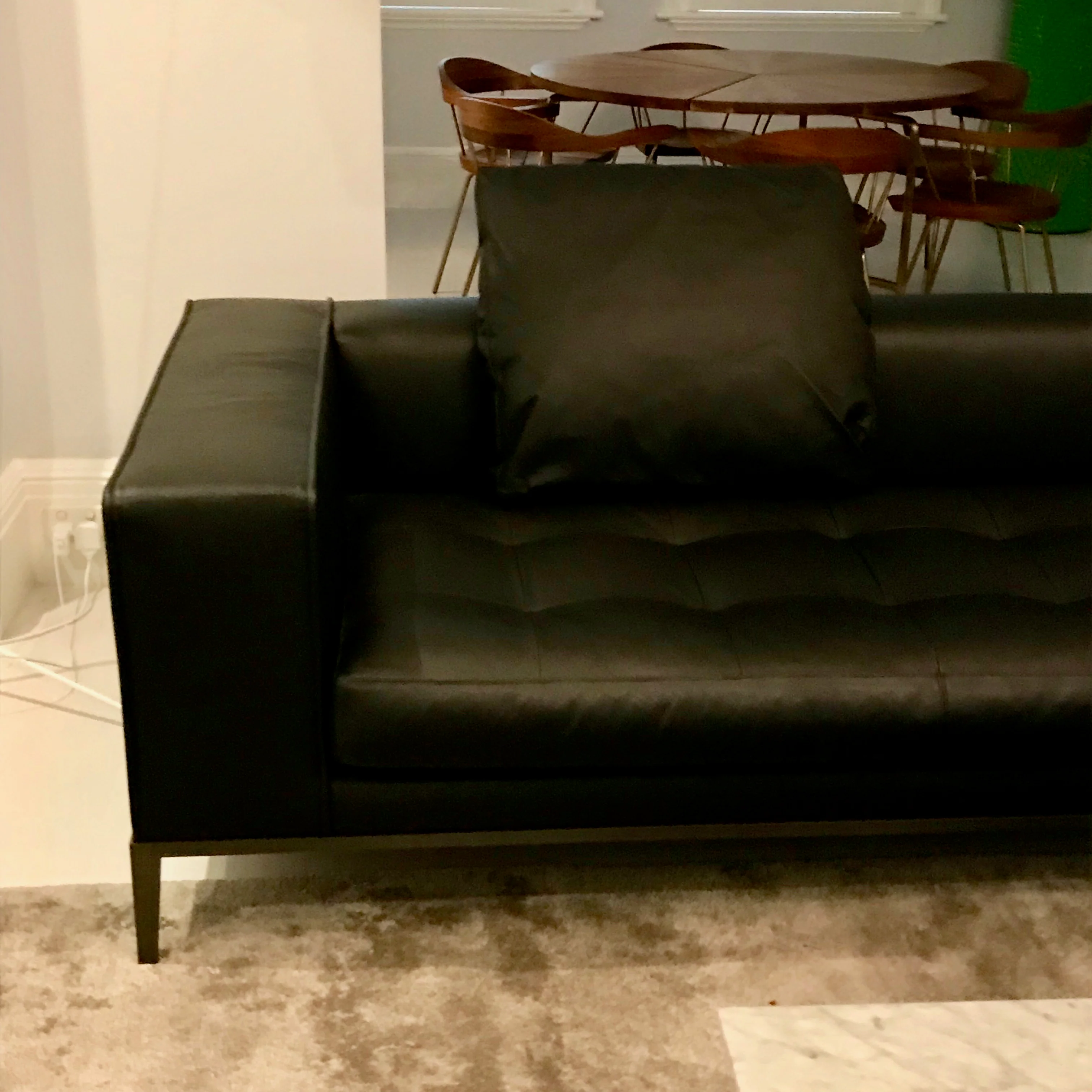 The sofa with a one-piece seat is available in three sizes with the option of quilted stitching, both in the leather and fabric versions. Quilted stitching also graces the large armchair and ottoman. The trims and feet are available in varnished extruded aluminium: bronze, nickel and black. Simplex sofa with a one-piece seat and the ottoman are also offered with a skirt option. The sofa we have on offer is in as new condition in black leather with bronzed nickel painted base. The sofa was purchased in June 2018 and does not fit in the space.