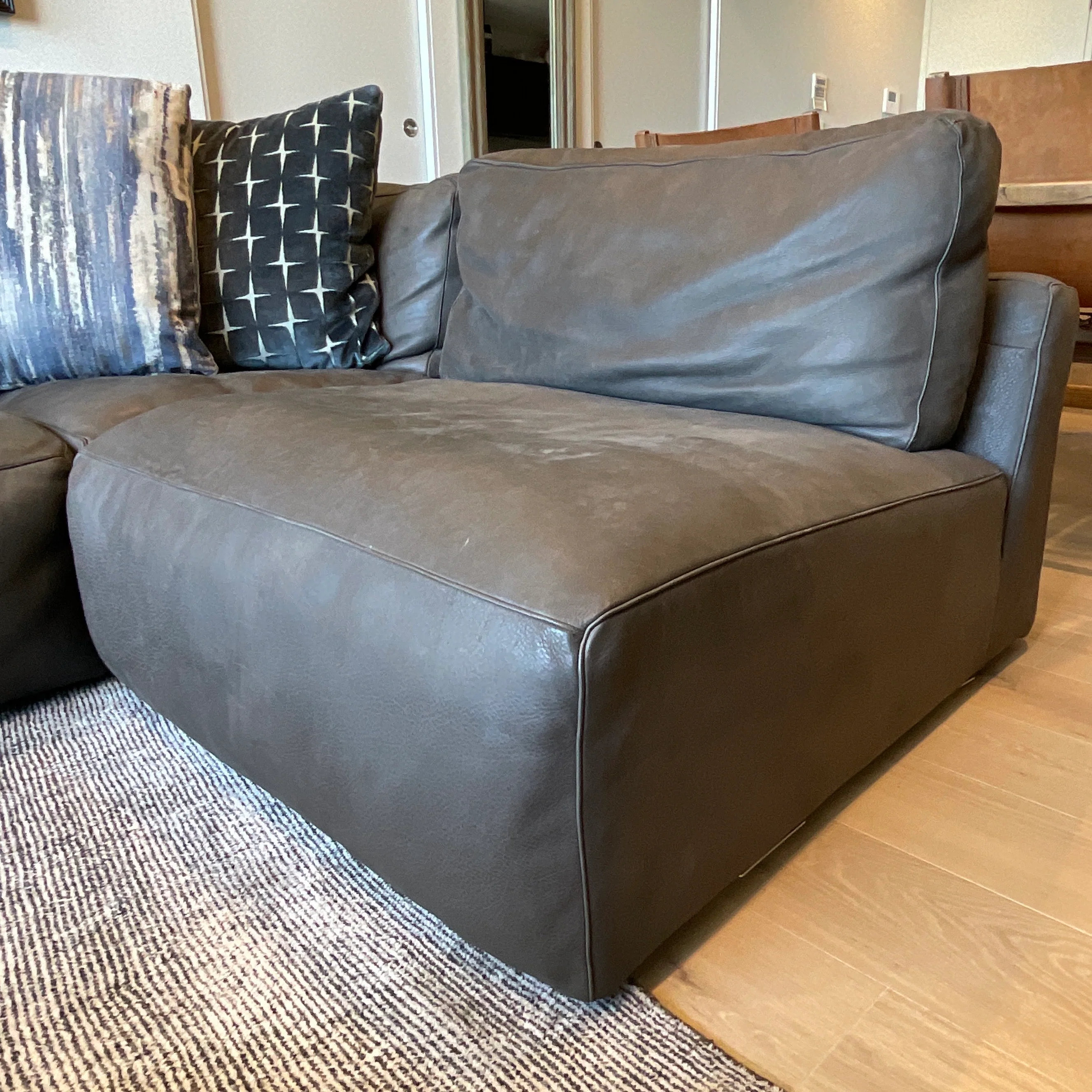 Modern deep-seated modular sofa upholstered in signature Estancia Leather Co. hand-finished South American leather. The sofa we have on offer is in FHP Graphite Leather. There are four modules that make this sofa;