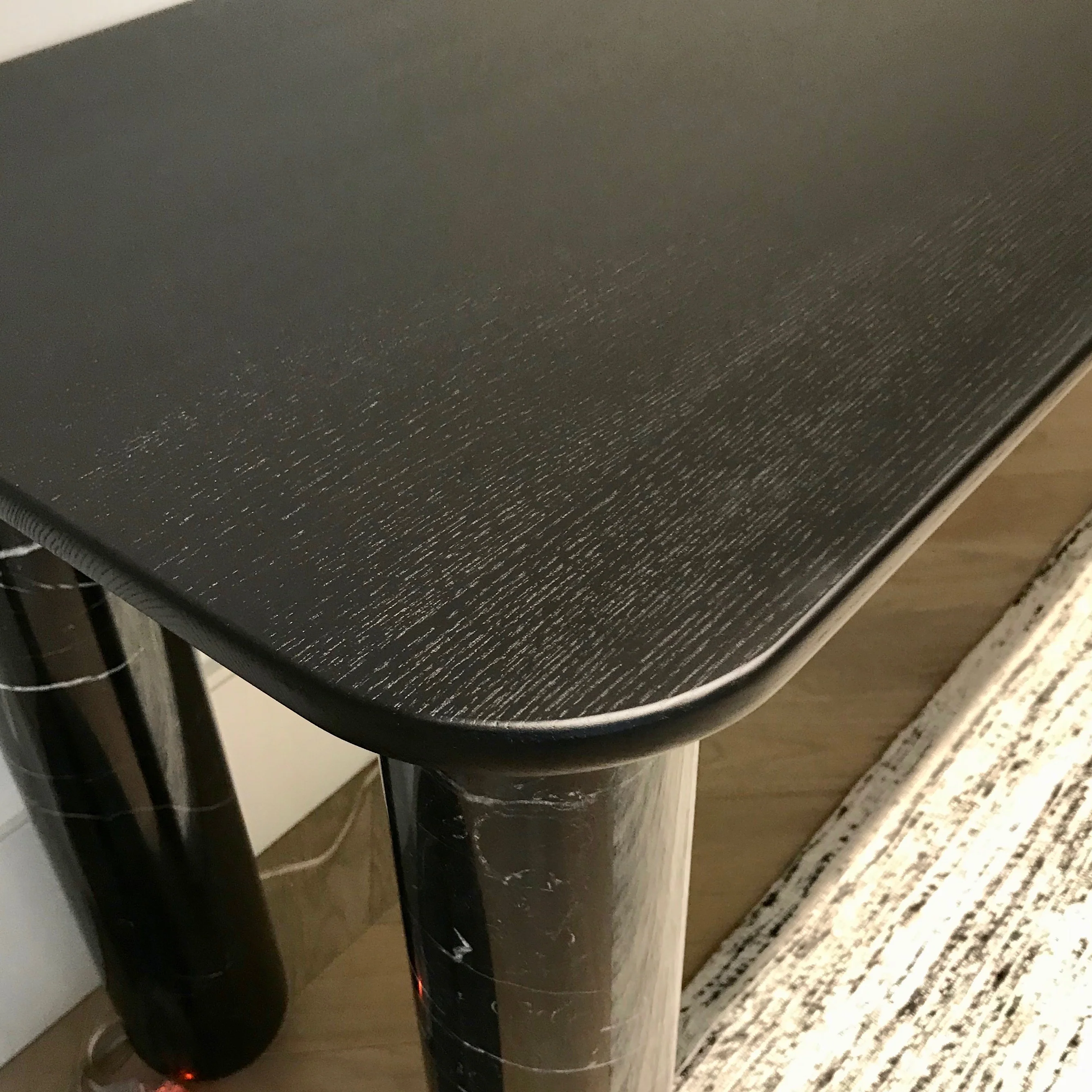Sunday is a family of coffee tables, dining tables and consoles with a simple and sculptural design. The mix of heavy marble legs and a thin solid wood top creates an interesting contrast while the rounded edges and generous proportions provide a comforting feeling. The table we have on offer has marquina black marble legs with black lacquer top.