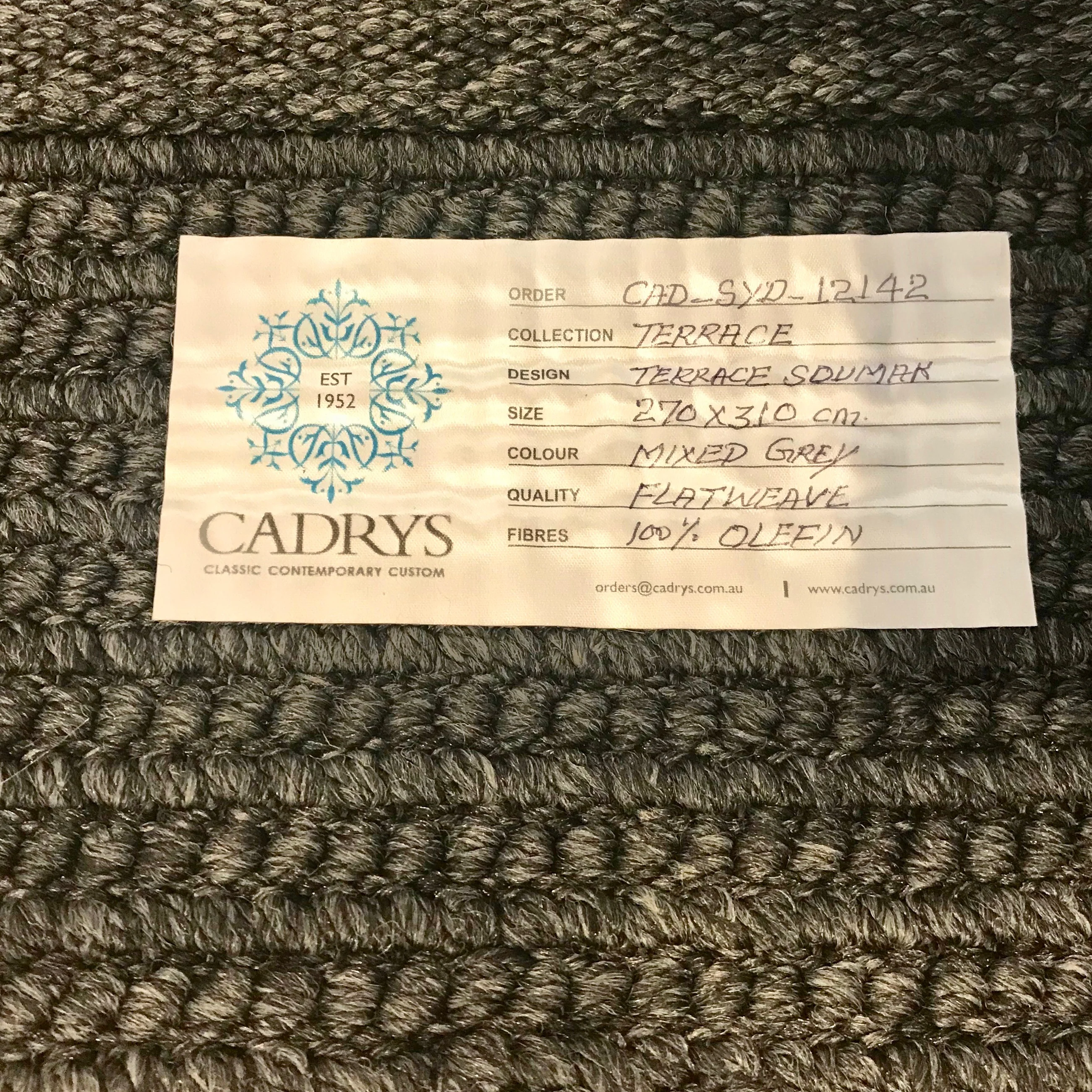 The Terrace are rug by Cadry's is sutable for both indoor / outdoor use. The rug is made from olefin. The rug we have on offer is in mixed grey.