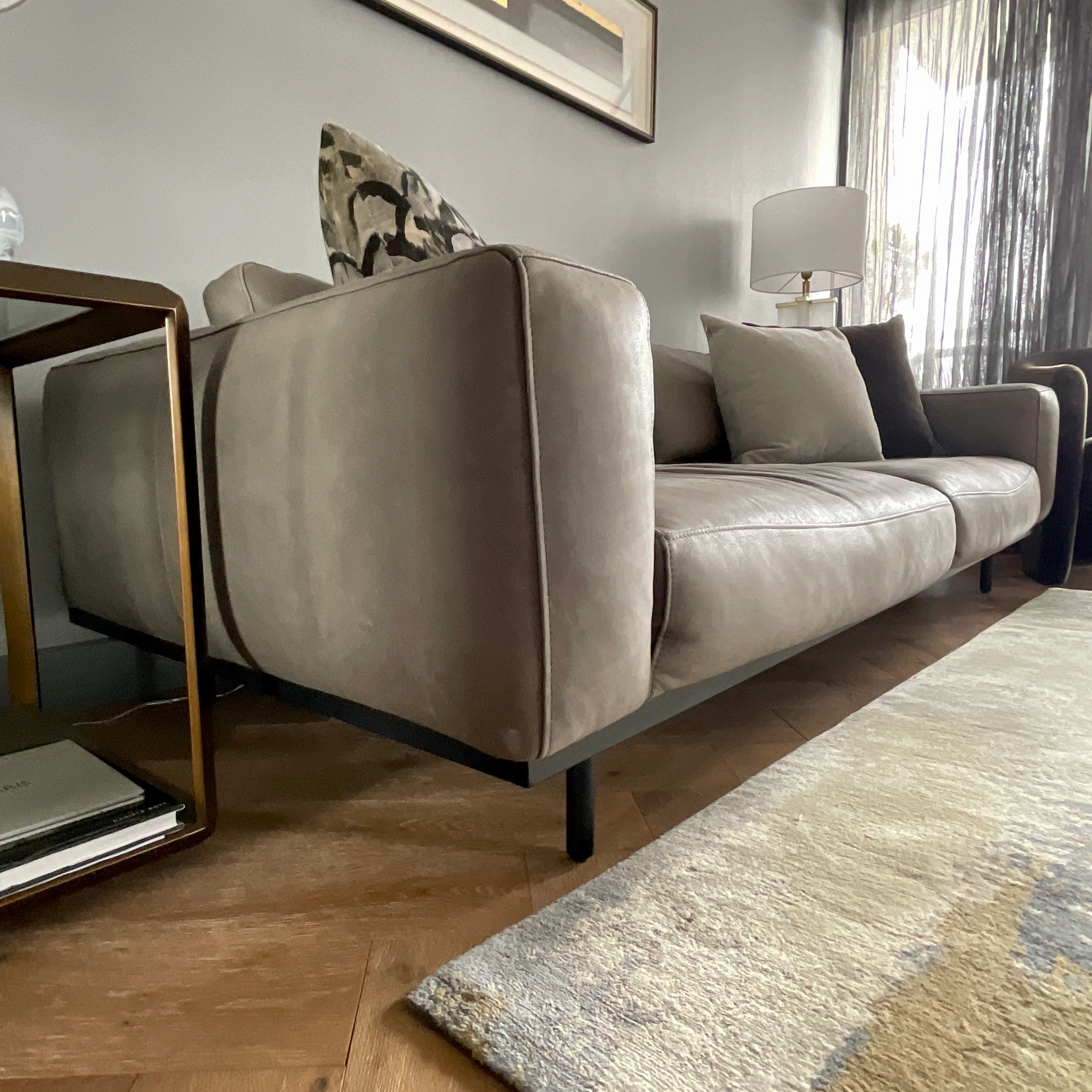 The Mateo sofa appears to float on a fine black steel frame. The sofa is upholstered in Estancia Leather Co creates a collection of products made from premium South American leather. Finished by hand, these leather hides are known for their natural beauty and hard wearing nature. These South American natural leather hides are aged by hand in a process that takes up to three days for one individual hide. Imperfections in the leather are celebrated.