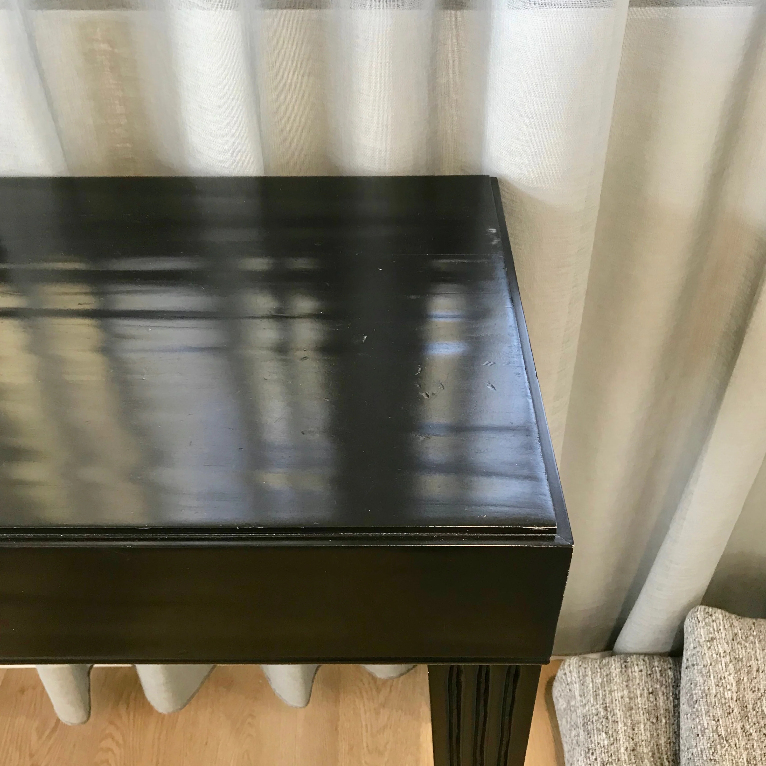 The timber console table we have on offer has two pullout drawers. The table has a black painted finish.