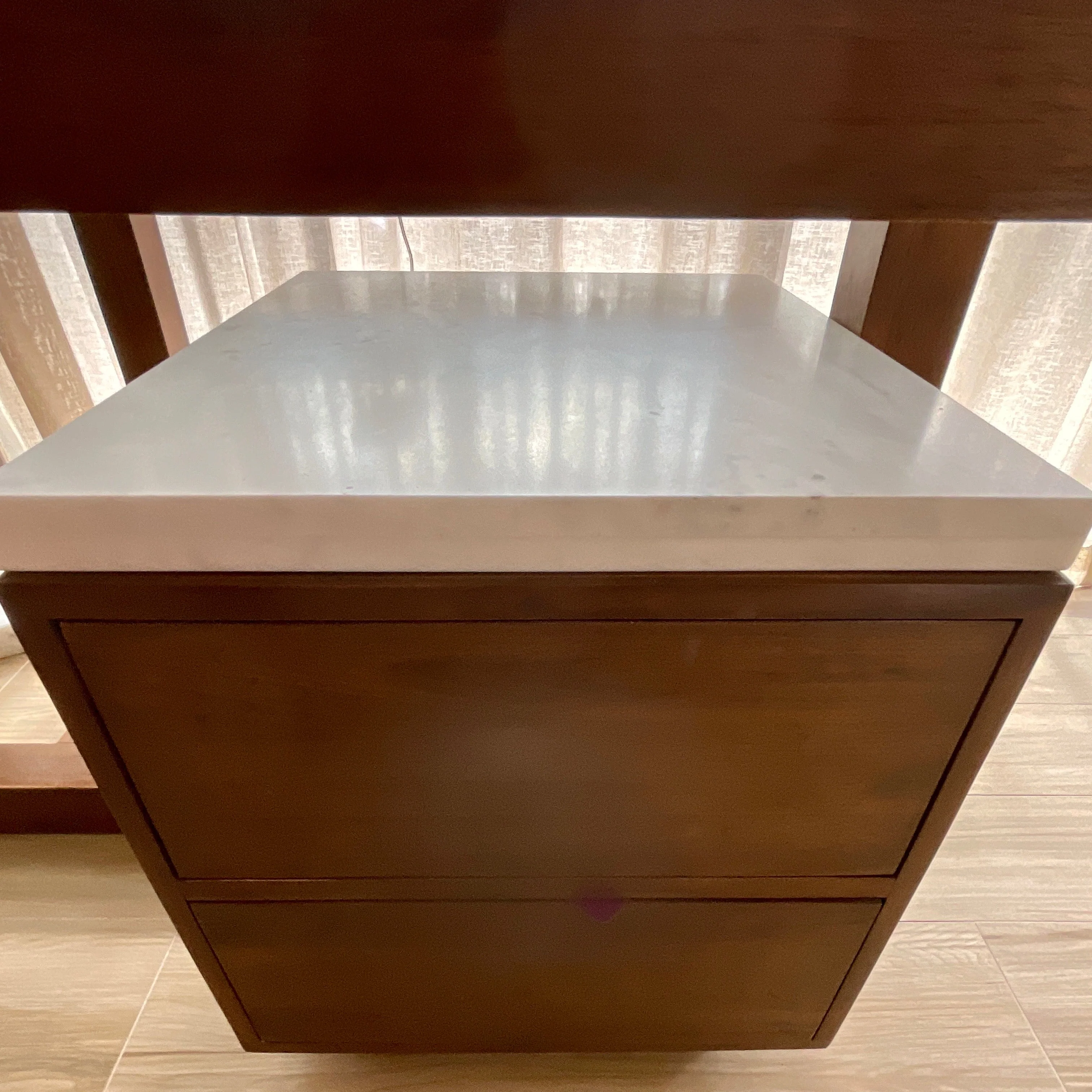 Striking timber desk frame crafted from solid oak with marble and timber drawer unit and clear glass top. The two drawer unit is right side facing.